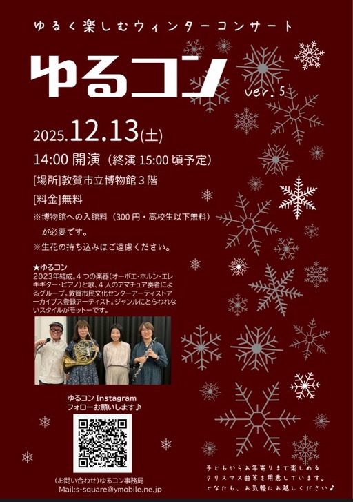 令和7年12月13日(土)14時~、当館3階講堂で4つの楽器(オーボエ・ホルン・エレキギター・ピアノ)と歌、4人のアマチュア奏者によるコンサートが開催されます。 子どもからお年寄りまで楽しめるクリスマス曲等を演奏します。どなたでもお気軽にお越しください。 コンサートの観覧は無料ですが、博物館の入館料(300円・高校生以下無料)が必要です。